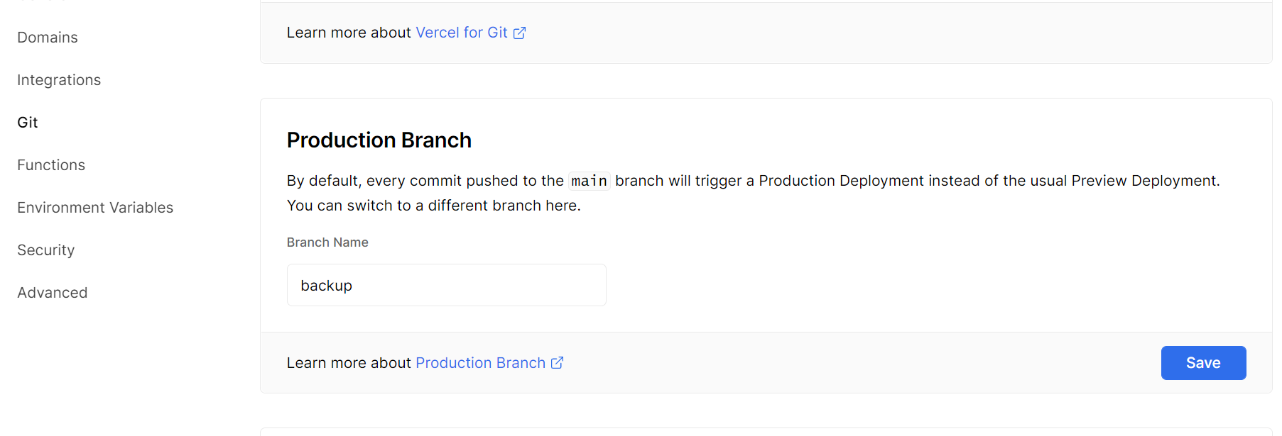 cname-china.vercel-dns.com。 - 将 Git Branch 里的内容改为存放自己博客备份的分支,比如我的就是 backup 分支。同时也可以将分配给你的二级域名也改成这个分支。