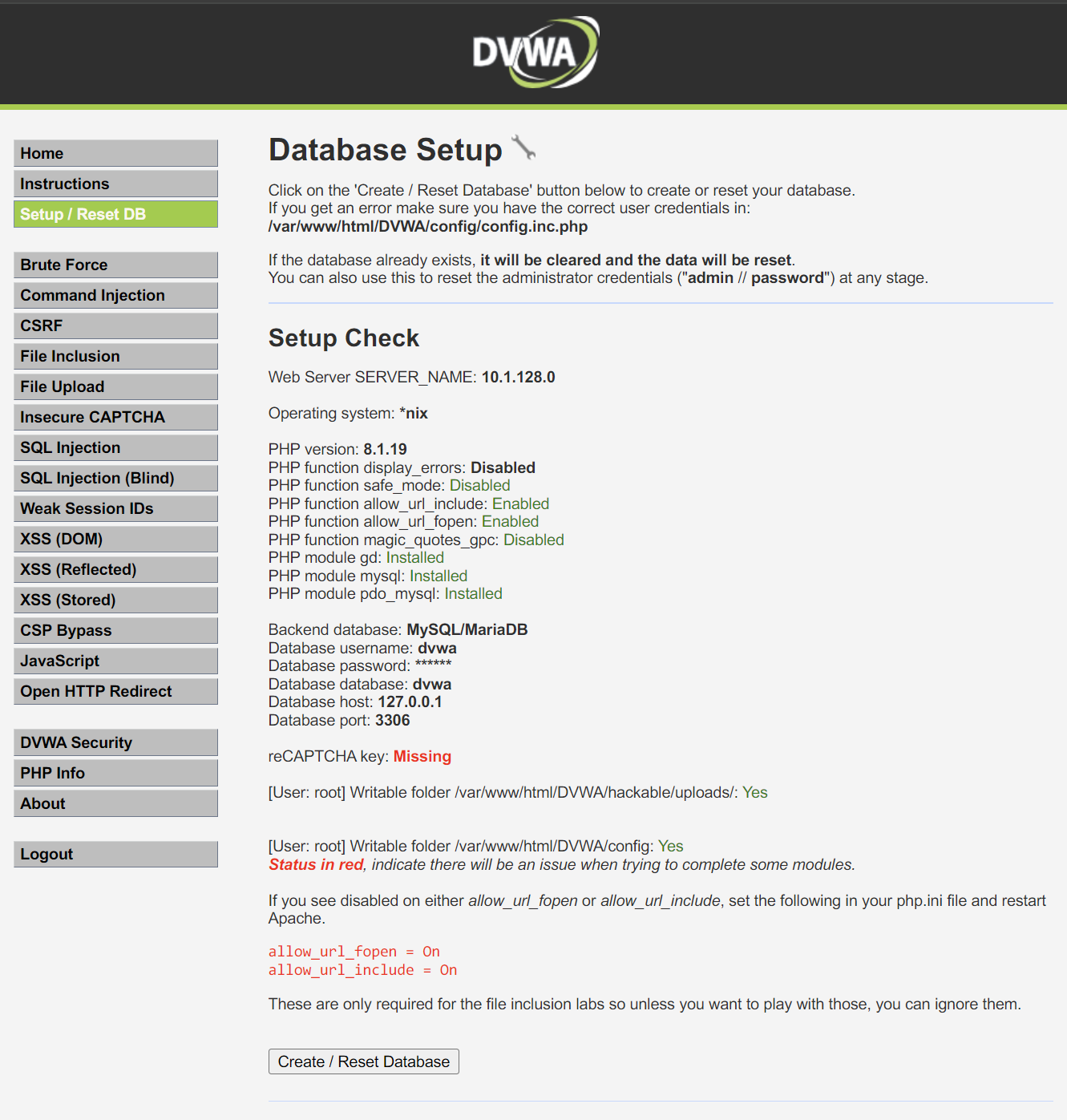 首次登录时,DVWA 将提示您创建数据库。点击 "Create / Reset Database" 按钮,DVWA 将自动创建所需的数据库。